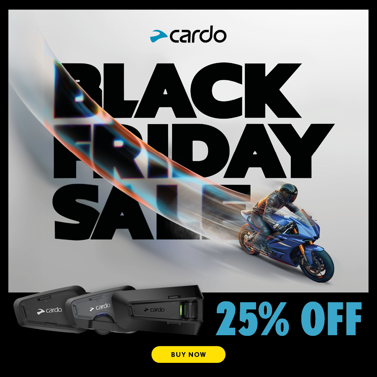 Gear up for Black Friday with unbeatable savings on CARDO communications! Enjoy 25% off industry-leading Bluetooth systems.