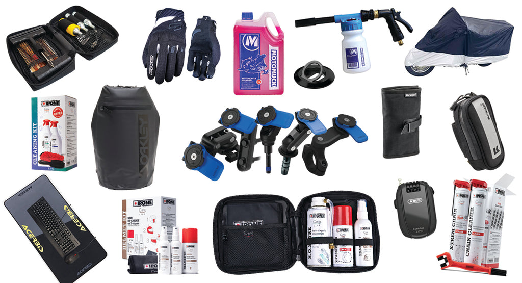 IPONE Road Trip Kit: Roadside rescue kit. 1x 100ml X-Trem Chain lube (road specific), 1x 200ml SOS Tyre Repair, 1x 100ml Helmet'Out Exterior Cleaner, & 1x microfiber cloth (D.G).