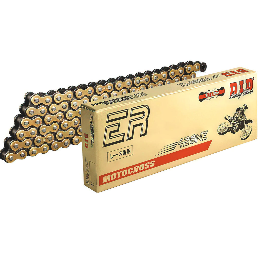 428 = chain pitch; NZ = chain model; G&B = gold and black chain colour; 120 = number of chain links (bike/sprocket specific – please check fitment charts or contact us)