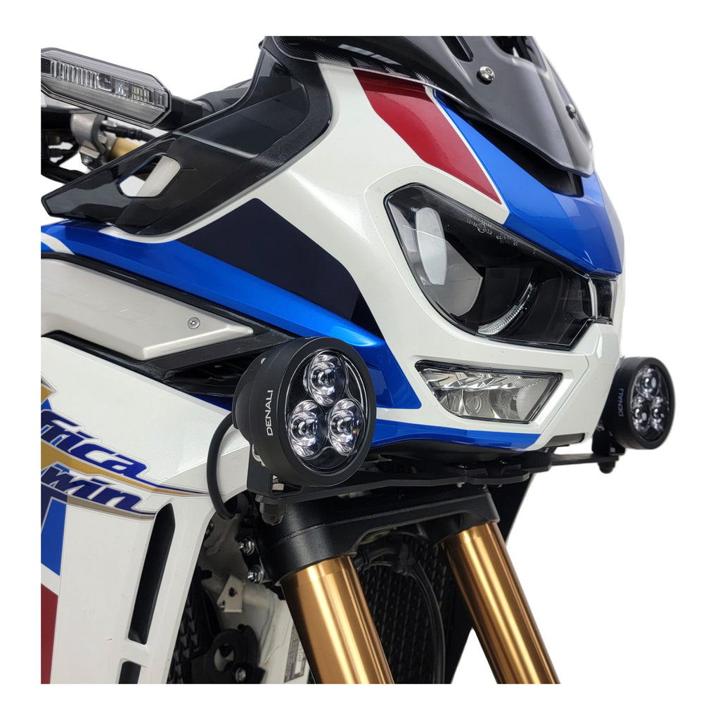 This vehicle-specific driving light mount allows you to mount any DENALI driving light in the optimum location on your Africa Twin 1100 Adventure Sports model, right below and to the outside of your headlight. The design features a heavy-duty steel bracket assembly that securely mounts to the Africa Twin 1100 fairing support. The bracket has an M8 mounting hole for the light pods and includes all necessary mounting hardware.