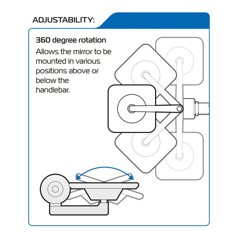 - 360° rotation: allows the mirror to be mounted at either end of - and positioned above or below - the handlebar.