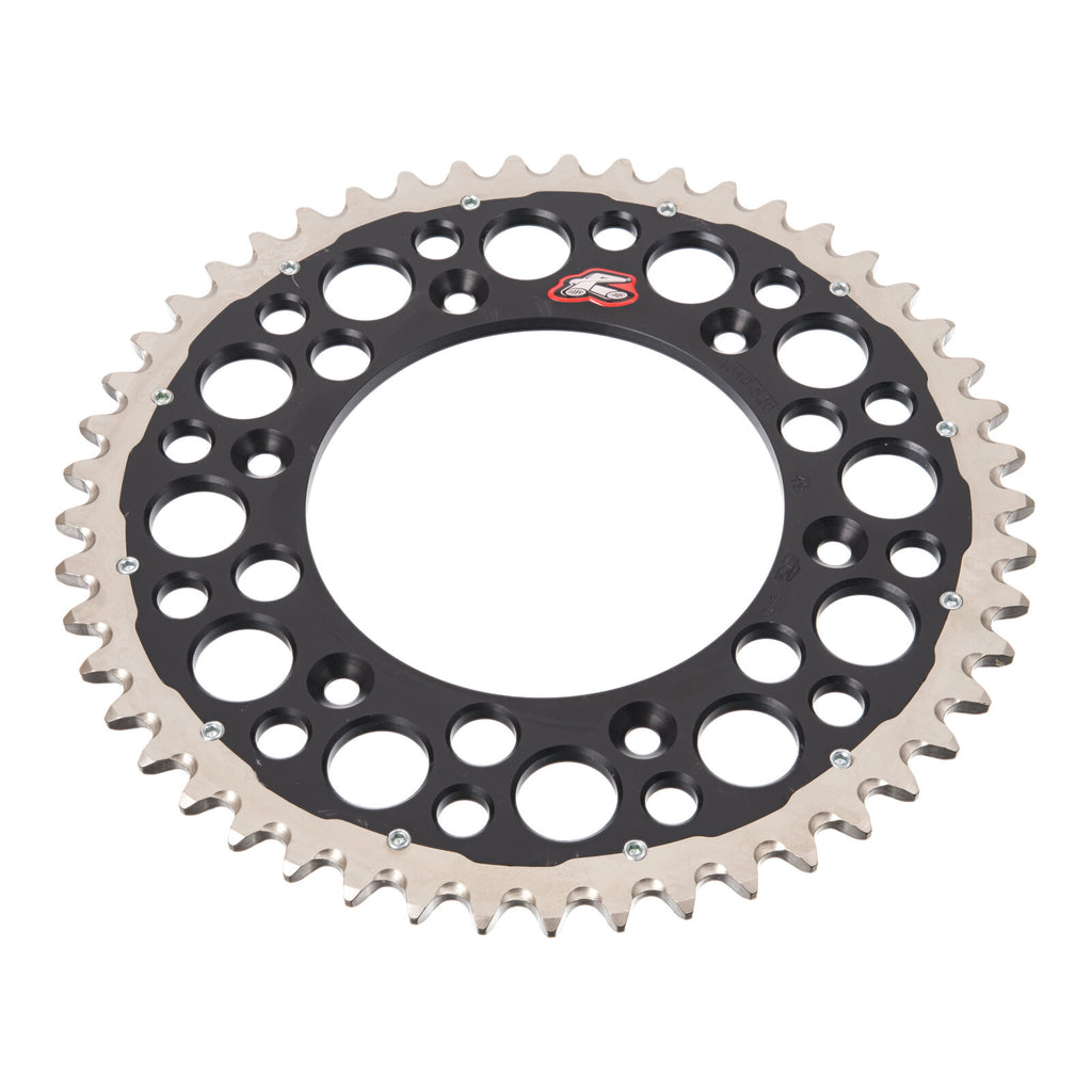 The Renthal Twinring Rear Sprocket is a long-lasting durable Off-Road sprocket that was developed and tested over the course of 5 years. The unique flat face two piece design keeps weight to a minimum and maximizes durability all while keeping a narrow profile. The outer steel ring is expanded at 200°C and then fitted to the aluminum inner before cooling, this process creates a permanent bond while flat socket set screws prevent lateral movement between the rings.