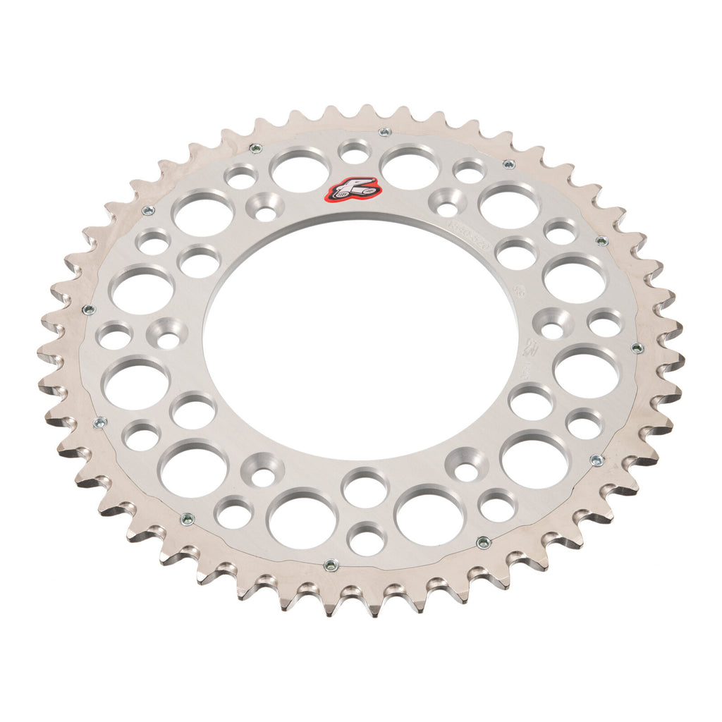 The Renthal Twinring Rear Sprocket is a long-lasting durable Off- Road sprocket that was developed and tested over the course of 5 years. The unique flat face two piece design keeps weight to a minimum and maximizes durability all while keeping a narrow profile. The outer steel ring is expanded at 200°C and then fitted to the aluminum inner before cooling, this process creates a permanent bond while flat socket set screws prevent lateral movement between the rings.