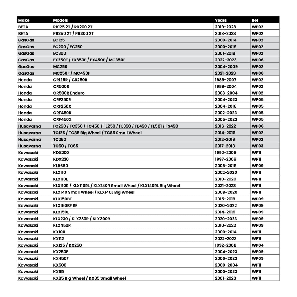 Note: Some KTM/Husqvarna/Gasgas models may require using the OEM cam or the additional purchase of White’s cam set WPGRPLGC13.