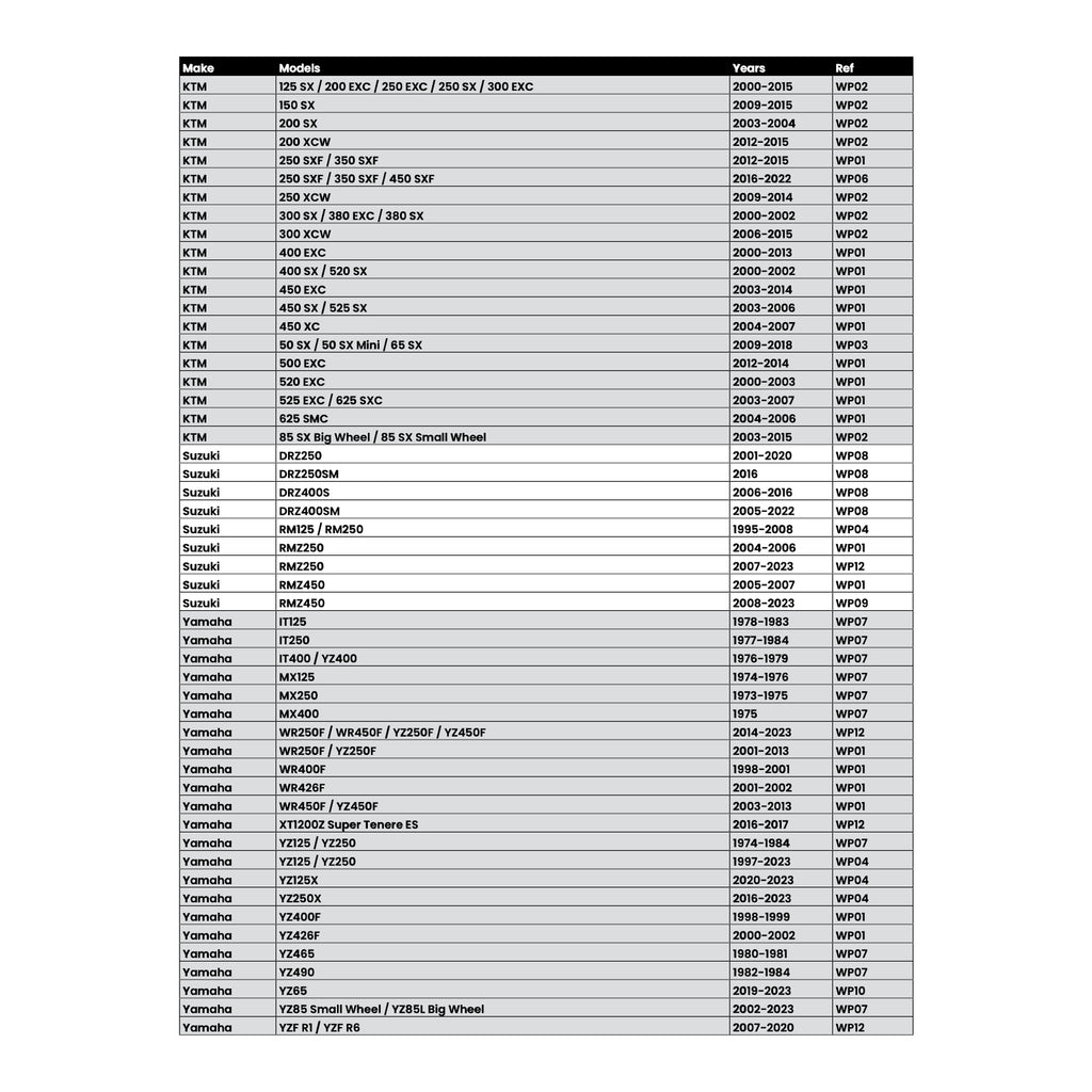 Note: Some KTM/Husqvarna/Gasgas models may require using the OEM cam or the additional purchase of White’s cam set WPGRPLGC13.
