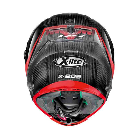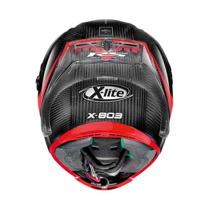 The X803RS Ultra Carbon is packed with features and enhanced by an exclusive racetrack setup. It comes with an additional clear visor, a Racetrack Aerodynamic Spoiler (removable), and an exclusive adjustment system for the position of the liner. Also includes all the same high quality features of the original X803 Ultra Carbon, such as the Nolan Emergency Release System to allow emergency teams to remove the helmet with minimal risk of further injury, Racing Air Flow ventilation system to keep you cool, and an Adjustable Stability Device so you can optimize air-flow for your own body size and riding style, as well as the usual premium features like a double action, Pinlock® visor, Single Block cheek pads, washable carbon inner liner and a revised chin shape to improve comfort.