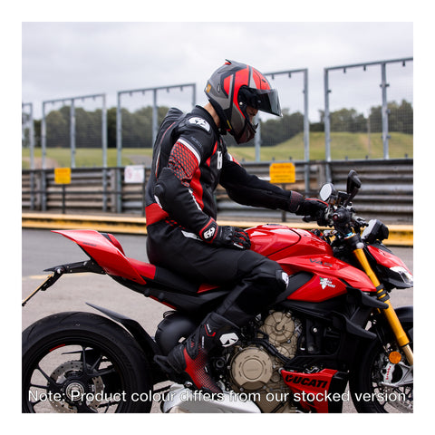 The NEXUS leather one-piece suit offers CE AAA-rated protection, CE level 2 protectors at the shoulders, elbows, knees and hips, removable knee sliders, TPU abrasion-resistant cups and engineered stretch zones at movement-critical areas. Matching gloves available.