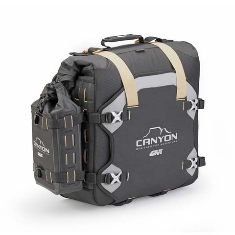 Built for serious adventure, the Givi Canyon GRT709B side bags offer 70 litres of total storage (35 litres per side) without the bulk or rigidity of traditional hard panniers. Designed to withstand rough terrain and harsh weather, these bags are made from a combination of abrasion-resistant Cordura, Hypalon and TPU fabrics. A high-frequency welded waterproof inner liner keeps your gear bone dry, while the roll-top closure adds extra peace of mind in wet conditions.