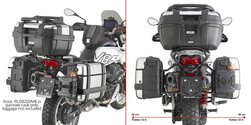 To fit panniers, you will need a Givi PL rack. You can use the PL8209CAM for Givi's Trekker Outback panniers, or a PL8209MK for Givi hard or soft Monokey panniers and both racks can be turned into Rapid Release racks using the 14RKIT.
