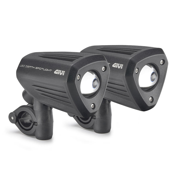 The new auxiliary spotlights from GIVI feature a black painted aluminium housing and are easy to install on all engine guards and mounts with a diameter between 21 and 25 mm.  With a power output of 25W each, these spotlights generate a maximum light output of 6000 lumen, and guarantee an irradiation range of 380 metres, increasing visibility in bad conditions.  They offer an IP68 waterproof rating and are also resistant to rust and dust, making them suitable for use in heavy rain and extreme conditions.