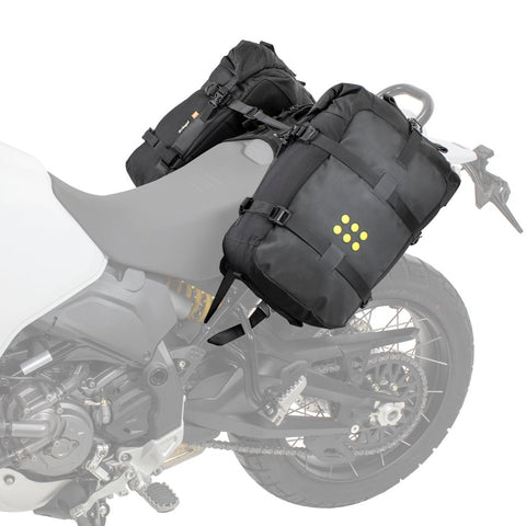 Designed to be a perfect fit on the DUCATI DESERT-X with a custom shape and specific fitting hardware, the KOSBA-I OS-BASE is an 'over the seat harness' for mounting OS-6, OS-12, or OS-18 ADVENTURE PACKS (sold separately) as soft panniers, with no need for metal frames. This system provides a super-tough, lightweight carrying solution, with no bodywork alterations needed. The fitting hardware gives the flexibility to mount a one, two, or three-pack set-up, depending on your type of ride. The set-length straps make mounting quick and easy, and the custom shape provides a tight, secure fit with plenty of distance from the exhaust. The New X-STRAPS provide extra pack stability for heavy loads or extreme off-road riding. It takes less than a minute to mount and just seconds to remove it.