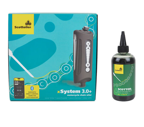The xSystem 3.0+ Bluetooth-enabled lubrication system for chain drive motorcycles simplifies your chain maintenance with easy control via the Scottoiler App.