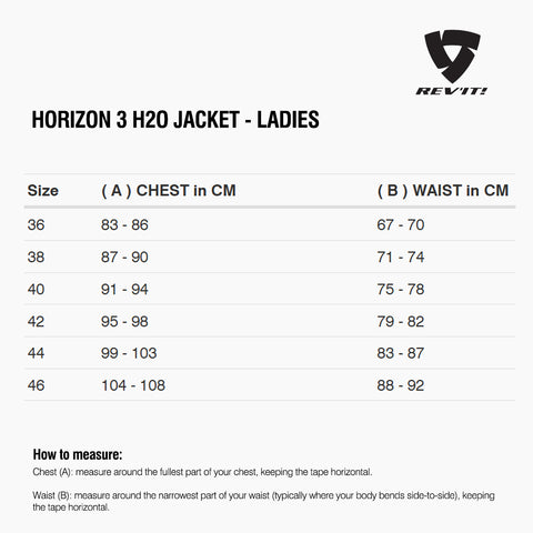 The multi-season, waterproof motorcycle touring jacket for women, with on-demand ventilation. REV'IT!'s Horizon 3 H20 Ladies jacket brings you the functionality of a high-end waterproof touring jacket at an affordable price. REV'IT! have laminated their renowned Hydratex®|Lite membrane to the inside of the outer shell, creating a 100% waterproof motorcycle jacket with little to no water pickup. For rides in colder temperatures, there is a detachable and separately wearable thermal liner. With the detachable thermal liner removed, you can easily open the front ventilation panels while riding. The two mesh panels on the chest and the two exhaust vents around the back change your waterproof touring jacket into a highly ventilated jacket. The Horizon 3 H2O Ladies motorcycle jacket is equipped with REV'IT!'s award winning SEEFLEX™ CE-level 2 protectors at the shoulders and elbows in adjustable pockets, and is prepared for a safety upgrade via the SEESOFT™ CE-level 2 back protector insert. One jacket for four seasons: the Horizon 3 H2O Ladies jacket is the perfect choice for all rides in all weather, all year.