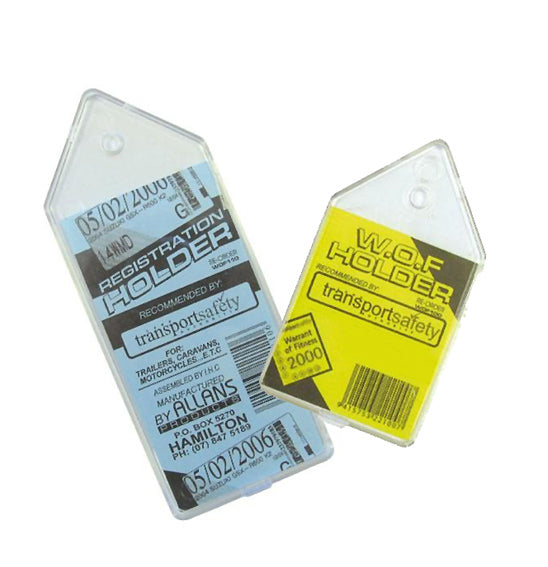 Plastic WOF and Rego Holders for motorcycles, trailers and caravans.