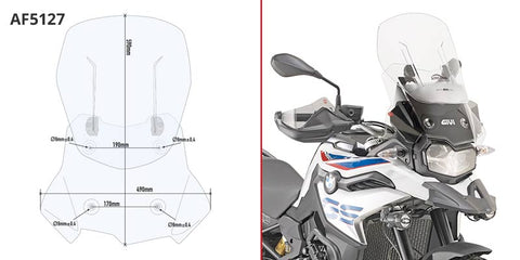 AF5127 - Specific sliding wind-screen transparent, Airflow. Maximum height 59 cm (12 cm of extension), width 49 cm. To be mounted instead of the original screen. Specific kit D5129KIT also needed for F750 GS and F800 GS.