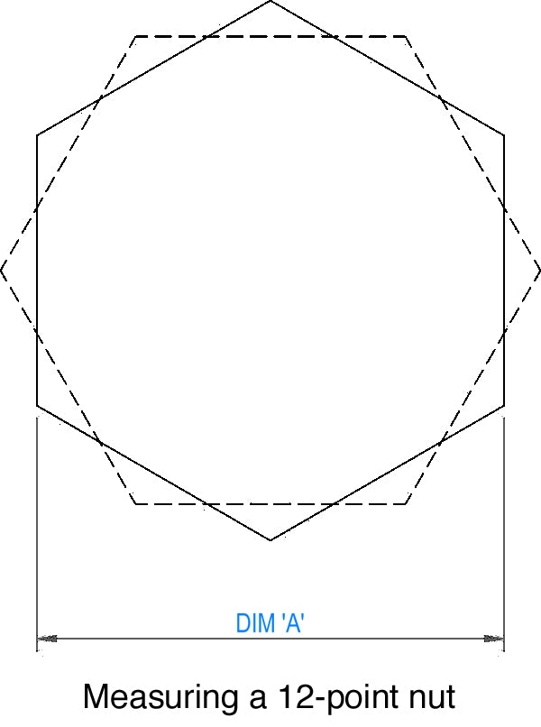 Confused by 12-point nuts? A 12-point nut is simply two hexagons overlaid at 30° to each other. The size is measured exactly the same as a normal hexagon nut - across the flats of the hexagon. Take a look at the diagram to see how to correctly measure and size a 12-point nut.