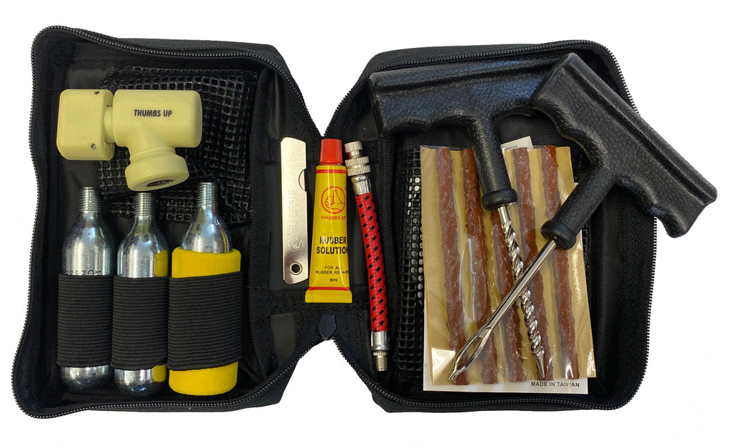 Tubeless tyre puncture repair kit and CO2 bottles in a black canvas carry case.