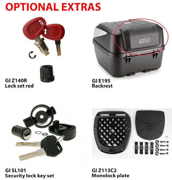GIVI’s latest addition to the scooter topbox line up takes a bold new direction in style. Developed with the patented Monolock System, the new B32 Bold has been specifically designed for maximum storage capacity, and is big enough to fit a modular helmet. Suitable for smaller displacement motorcycles, mopeds and scooters and comes with a universal mounting plate.