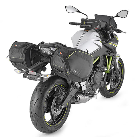 New from Givi, these soft pannier bags are a light-weight option for carrying larger loads on your bike. Made of tough 600D polyester with inner reinforcing, these bags come with a fluro waterproof inner bag, so your gear is easy to find and, more importantly, stays dry through any weather. If you need just a little more space, they expand, from 20 litres to 30 litres each, with an additional multipurpose elastic lanyard on top for any last minute extras. Load compression belts allow the bag to be stabilized to the side frame.