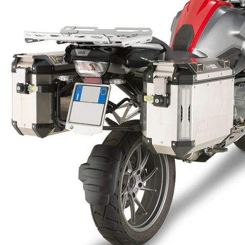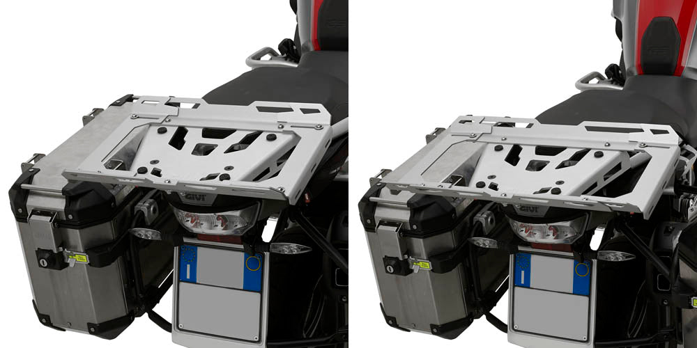 Expandable aluminum bag holder. Mounts on the aluminium rear supports SRA_ _. Width from 413 to 513 mm. Suitable for the transportation of roll bags with a capacity from 30 to 50 Lts. Max load 6 Kg