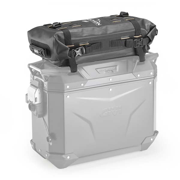The GRT724B is waterproof thanks to its removable inner liner with heat-welded seams and a roll-top closure that keeps out heavy rain and grit. It straps directly to compatible Canyon range bags or to your luggage rack using included fastening straps, giving you a secure, modular setup for tools, spares or essentials.
