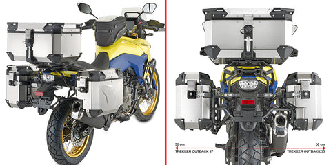 To fit panniers, you will need a compatible rack. The rack you require will be dependent on what panniers you choose. For Trekker Outback EVO panniers you will need a Cam rack (PLOS3125CAM), which pairs best with the OBKE3733 pannier set (37 litre left and contoured 33 litre right). Or for V37 or V37 panniers, you will need a PLX rack (PLX3125). Or for soft luggage, choose from the Adventure range, Touring range or Urban range.