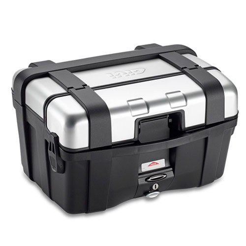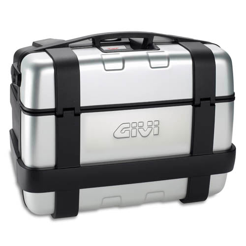 Combining the best of both worlds, adventure riding or touring, Givi's Trekker range of cases are constructed from a rugged plastic body, with an aluminium outer shield for stunning looks and extra protection. TRK cases attach using Givi's patented and time proven MONOKEY® system which allows the use of a single key for opening the lid, as well as for releasing the case from its mounting plate. As well as the entire lid opening, the 33 and 46 litre cases feature a smaller lid that can be opened whilst the bag is attached to the bike giving easy acess to the contents of the case.