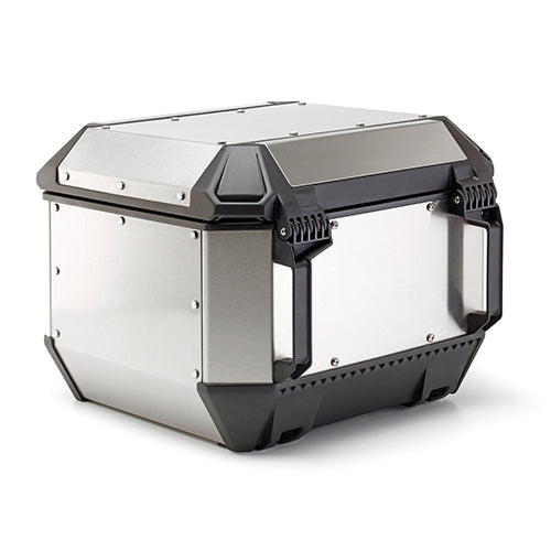 Alaska cases attach using Givi's patented and time proven Monokey system, which allows the use of a single key for opening the lid, as well as for releasing the case from its mounting plate. Particular care has been given to ensuring the product is durable and repairable: the removal system, the stabilisers at the bottom, the base and other components can be easily replaced, greatly extending the useful life of your top case. Available in two finishes, natural silver or matt black painted aluminium.