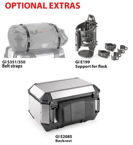 Givi's Trekker Alaska range now has a matching top case. This roomy top box has a large 56 litre capacity and will comfortably hold 2 helmets. Alaska cases attach using Givi's patented and time proven Monokey system, which allows the use of a single key for opening the lid, as well as for releasing the case from its mounting plate. Particular care has been given to ensuring the product is durable and repairable: the removal system, the stabilisers at the bottom, the base and other components can be easily replaced, greatly extending the useful life of your top case. Available in two finishes, natural silver or matt black painted aluminium.