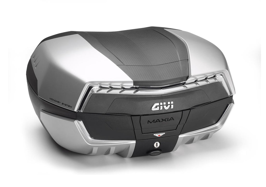 The new V58 is the fifth generation of Givi’s Monokey Maxia top cases. With a massive 58 litre capacity, this is one of the roomiest top cases on the market, but with clean, aerodynamic lines and low weight, it feels and looks incredibly streamlined. Ideal for touring, the V58 can easily hold two helmets. The V58NT version is black with a transparent reflector and four covers painted with an aluminium effect finish.