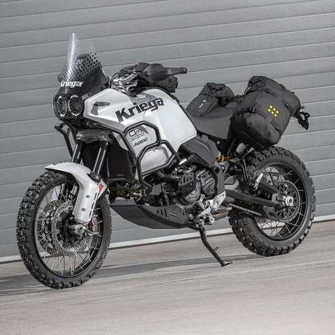 Designed to be a perfect fit on the DUCATI DESERT-X with a custom shape and specific fitting hardware, the KOSBA-I OS-BASE is an 'over the seat harness' for mounting OS-6, OS-12, or OS-18 ADVENTURE PACKS (sold separately) as soft panniers, with no need for metal frames. This system provides a super-tough, lightweight carrying solution, with no bodywork alterations needed. The fitting hardware gives the flexibility to mount a one, two, or three-pack set-up, depending on your type of ride. The set-length straps make mounting quick and easy, and the custom shape provides a tight, secure fit with plenty of distance from the exhaust. The New X-STRAPS provide extra pack stability for heavy loads or extreme off-road riding. It takes less than a minute to mount and just seconds to remove it.