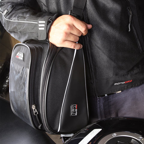 If you're sick of bulging motorcycle jacket pockets while you ride, but you don't want to lug a big motorcycle bag around, the Motodry ZXT-1 Tank Bag will be your perfect choice.