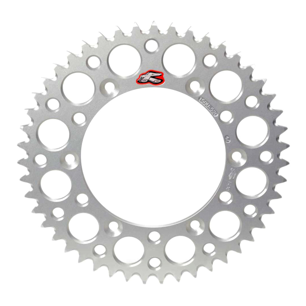 Renthal hard anodised rear sprockets are precision CNC manufactured to extremely high tolerances. The high strength is especially enhanced by using a 7075 T6 aluminium alloy coated in an ultra-hardwearing finish for extreme mileage. The rear sprockets computer-aided design gives the maximum reduction of unsprung weight at the rear wheel, to give maximum power transfer. The Renthal rear sprockets are 33% lighter than steel and the self-cleaning mud grooves prevent dirt buildup and help keep the sprocket clean.
